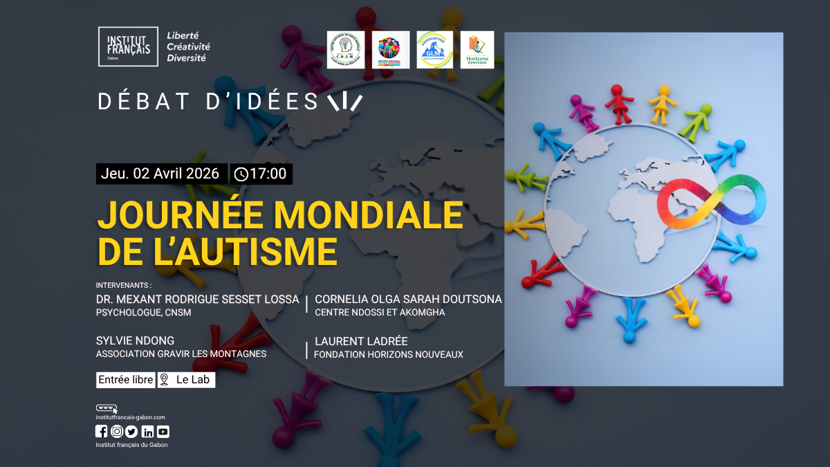 En cette journée internationale de sensibilisation à l’autisme, l’Institut Français au Gabon organise un débat d’idées dont le premier objectif est de sensibiliser sur les Troubles du Spectre Autistique (TSA) : leurs origines, leurs matérialisations, etc.. Les experts mobilisés feront un état des lieux de la détection de l’autisme jusqu’à sa prise en charge multiforme (éducation, action sociale, législative, insertion professionnelle) au Gabon,  mais aussi de la manière dont l’autisme est perçu dans la société gabonaise et les familles prises en charge. C’est un évènement destiné à tous ceux qui souhaitent mieux comprendre ce qu’est et implique l’autisme dans nos sociétés.